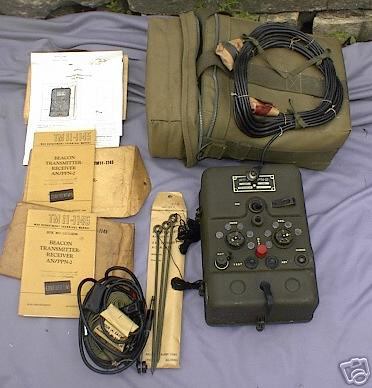 The URC-4, often referred to as a “pilot's rescue transceiver”, was sometimes part of an agent's equipment, to use as a beacon for air-dropped supplies [ref 105, 108, 109, 111, 114, 115, 125, 129, 133, 144]. The standard URC-4 was modified to mount on a camera tripod, and the dipole antenna was replaced with a ground plane, and tuned for a frequency other than the standard 121.5 MC [ref 111]. Since the antenna was a ground plane, there was a strong “null” in the signal as the aircraft flew over, to indicate when to make the drop. Agency testing of this system was performed with C-47 aircraft with AN/ARA-8 homing equipment. Two criticisms of the system: the specialized battery could be difficult to obtain in the field; and users were nervous about the long and continuous transmit time that was required, plus the super-regenerative receiver that radiated a signal as well. The URC-4 cost was $178 in 1956.