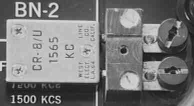 · A fixture has been added to the FT-243 crystal socket: it allows a crystal to be installed in the horizontal position, laying across the BN-2 label plate. The original crystal socket is still usable, and the second socket (for crystals with wider-spaced pins) is still there, also. Because of the crystal-socket modification, it could have been delivered to the field with a crystal already installed with the lid in place.