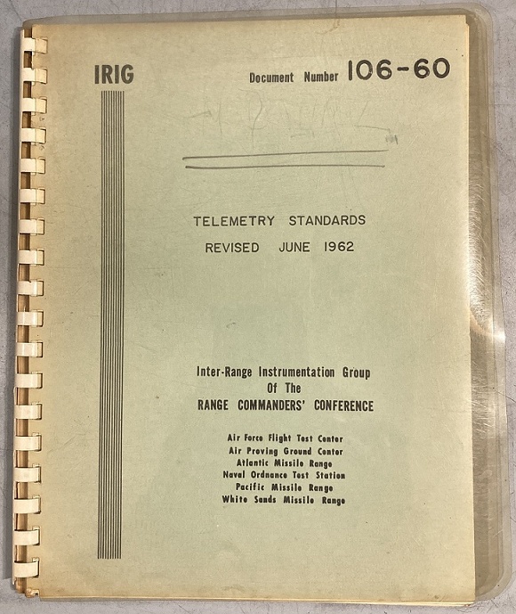 Standards for telemetry spectrums and equipment began to appear in 1948. Beginning in the 1950’s, an organization known as the Inter-Range Instrumentation Group (IRIG) was producing “Document 106, Telemetry Standards”. The 1960 version includes definitions for RF frequencies, subcarriers, multiplexing schemes, pulse-code modulation (‘PCM’, early digital encoding), and magnetic tape recorder/reproducer standards.