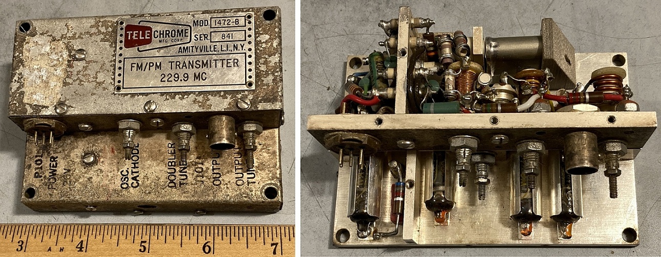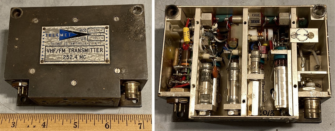 A telemetry transmitter, made in 1969, all solid-state. This example is a Dorsett model TR-320F, operating at 316.5 MC. The multi-pin connector includes inputs for +24V power, an enable input, and an FM input with a deviation of about 7 KC per volt. The total power input is about 1.1W, so it’s possible that it was used with a linear amplifier for higher output. It is unknown what the application was, given that it operates outside the IRIG telemetry band. Author’s collection, kindly provided by Terry O’Laughlin.