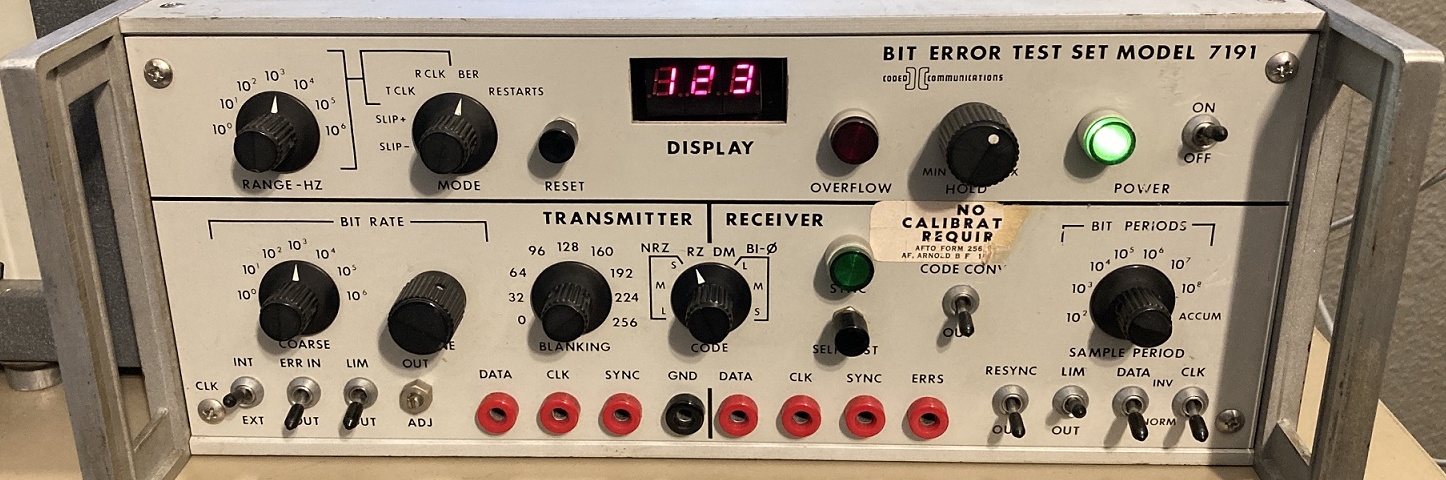 A Bit Error Test Set (“BERT”) made by Coded Communications in 1975. Used to evaluate the quality of PCM telemetry links. The “Transmitter” portion generates a pseudo-random serial bit stream, in various formats, using a Linear Feedback Shift Register (LFSR) at a rate adjustable from 1 bit per second to about 1 megabit per second. The “Receiver” portion compares the incoming data with the expected data, and counts the number of errors (and other parameters). The manufacturer apparently made equipment for ‘DECOM Systems’, and there is a patent number for the design assigned to Data-Control Systems in 1973. The circuitry includes about 120 TTL IC’s from the 7400 series. Author’s collection.